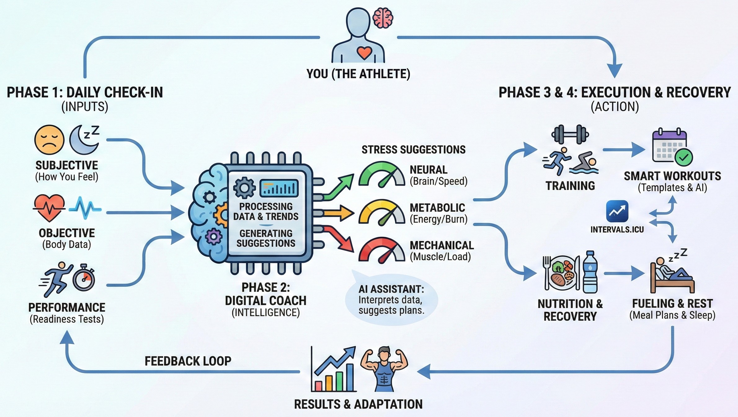 The Ultimate Guidance Loop: By combining our Digital Coach engine with the Adaptation Algorithm, the system provides a level of precision usually reserved for elite athletes with a dedicated team. While the Coach monitors your daily readiness and stress capacity, the Algorithm ensures that the physiological focus of your sessions aligns perfectly with your training state, providing the most optimal guidance to drive consistent progress.